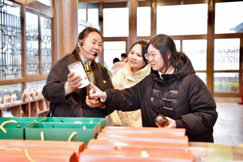 枣阳市王城镇白水村党支部书记谢云伦为游客介绍当地山茶油、葛根粉等土特产。(枣阳市纪委监委供图)